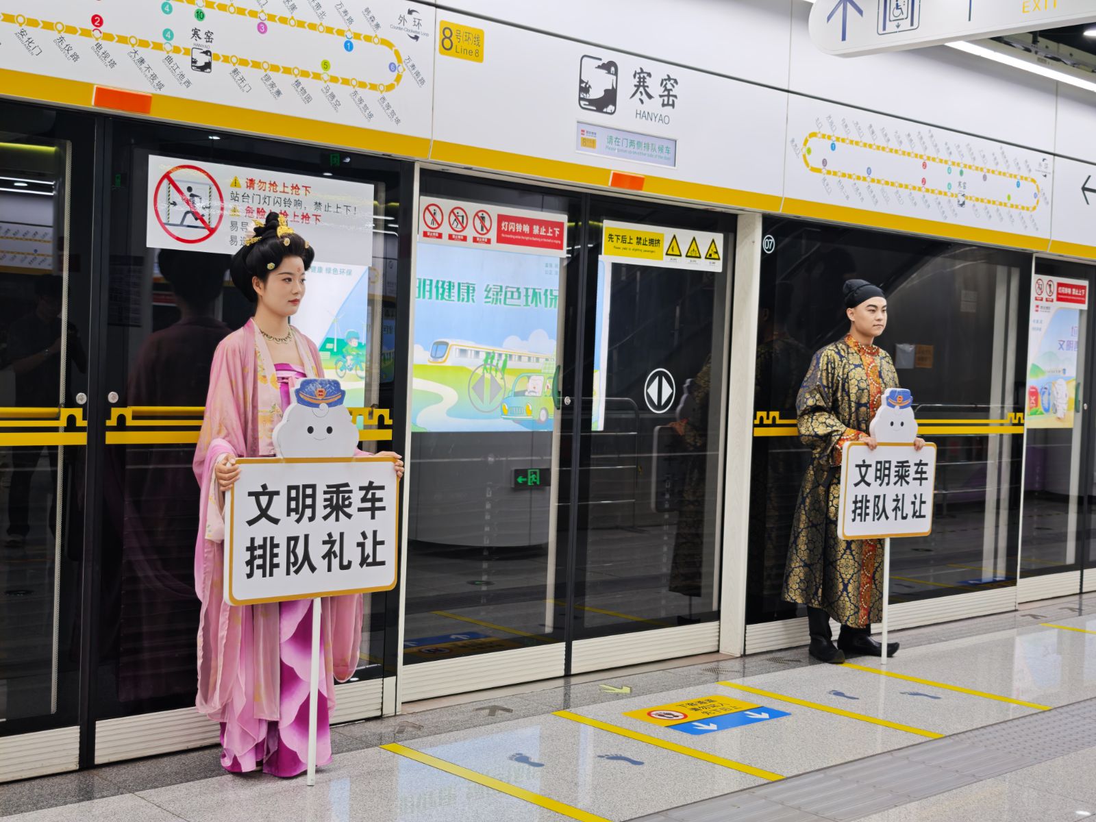 8月11日,西安地铁寒窑站迎来了一对特别的“出游搭子”,“穿越”而来的薛平贵和王宝钏一起走进地铁车站,在感悟寒窑气象万千的同时,与来往乘客共同践行文明出行新风。与此同时,依托团市委青年志愿者服务平台,西安地铁还组织了89名大学生志愿者在开远门、延平门、科技二路、省体育馆、寒窑5座车站,共同开展“排队日”志愿服务活动,积极践行“奉献、友爱、互助、进步”的志愿精神。
